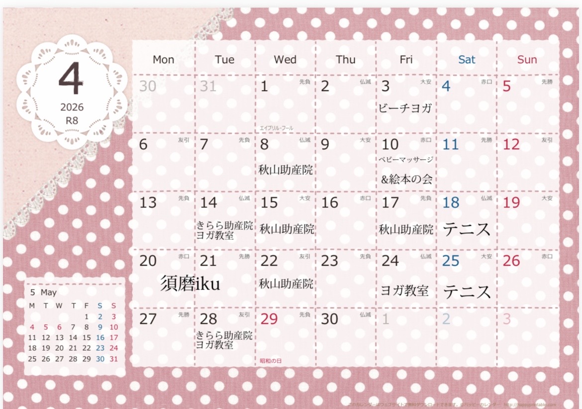◯きらら助産院でのヨガ教室と西須磨小学校での土曜日テニスクラブもご希望の方は、一緒に楽しみましょうね♪