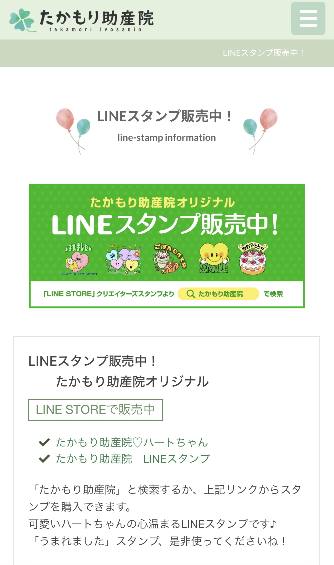 友人に作ってもらった、たかもり助産院オリジナルLINEスタンプのバナーと、